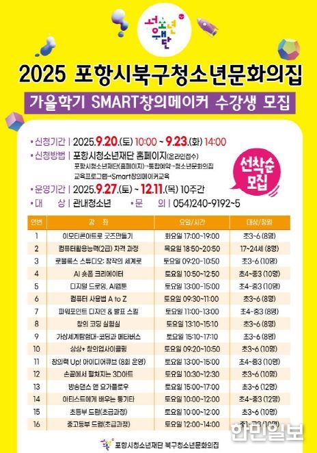 한민일보 서울포커스 김윤희 기자 | 포항시청소년재단 북구청소년문화의집은 지역 청소년들의 창의력 향상과 진로 체험을 위해 ‘2025년 가을학기 Smart창의메이커’ 프로그램 수강생을 선착순 모집한다.