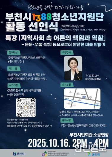 한민일보 서울포커스 김윤이 기자 | 부천여성청소년재단이 운영하는 부천시청소년상담복지센터는 시민의 자발적인 참여로 운영되는 청소년 민간 안전망의 활동을 공식화하기 위한 노력으로'1388청소년지원단 활동 선언식'을 2025.10.16. 부천시민회관에서 개최한다.