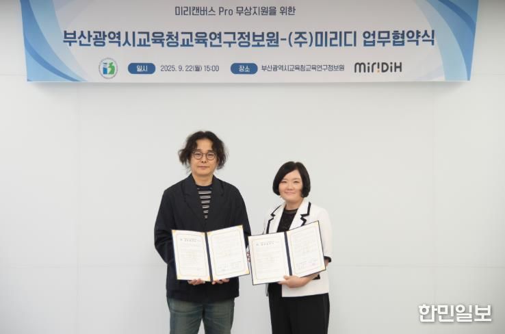 한민일보 서울포커스 임광현 기자 | 부산광역시교육청교육연구정보원은 지난 22일 오후 교육연구정보원 회의실에서 (주)미리디(대표 강창석)와 업무협약을 체결했다고 밝혔다.