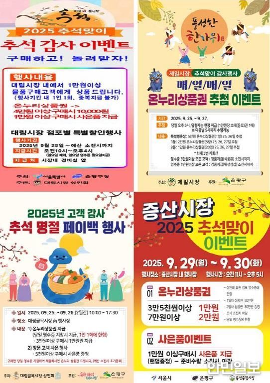 추석 명절 이벤트는 ▲대림시장, 제일시장 오는 25일부터 27일까지 ▲대림골목시장 오는 25일부터 26일까지 ▲증산종합시장 오는 29일부터 30일까지 진행된다.