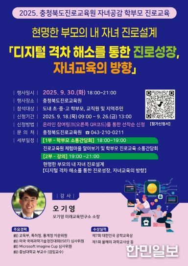 한민일보 서울포커스 임경복 기자 | 충청북도교육청 직속기관 진로교육원은 오는 30일 18시에 학부모들이 변화하는 미래사회에 맞춰 자녀의 진로설계 역량을 강화할 수 있도록 2025 하반기 학부모 진로교육을 운영한다고 밝혔다.