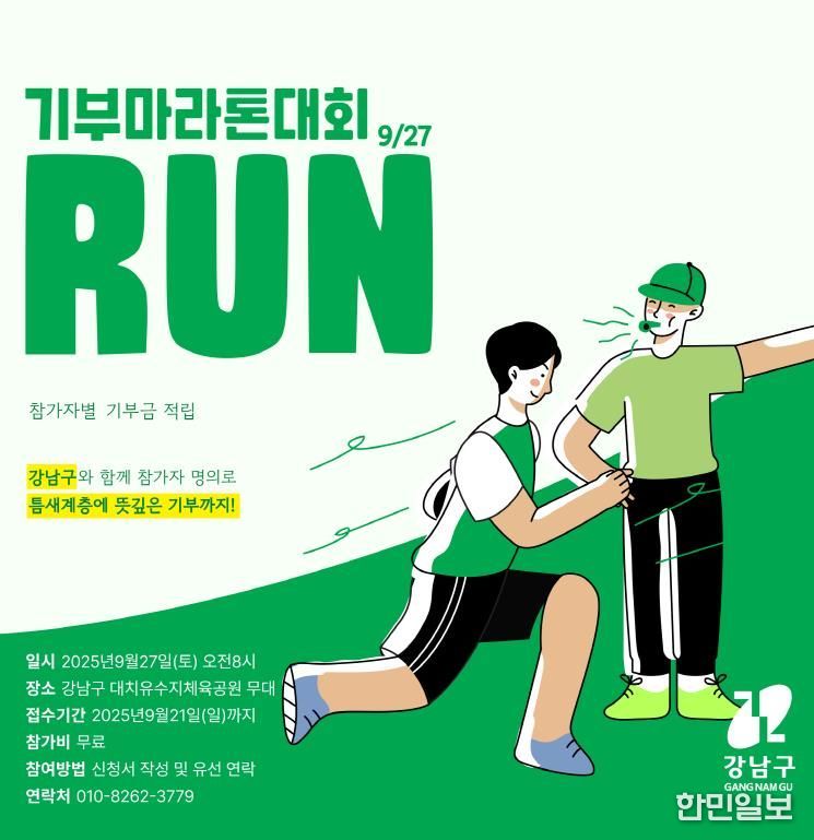 한민일보 서울포커스 박정민 기자 | 꿈이 모이는 도시, 미래를 그리는 강남구가 오는 9월 27일 오전 9시부터 오후 2시 30분까지 양재천 일대에서 ‘기부-Run 강남 달리기’ 행사를 개최한다. 이 행사는 참가자의 걸음과 달리기가 기부로 이어지는 기부 연계형 건강 캠페인으로, 건강한 나눔을 실천하는 지역사회 공헌 프로그램이다.