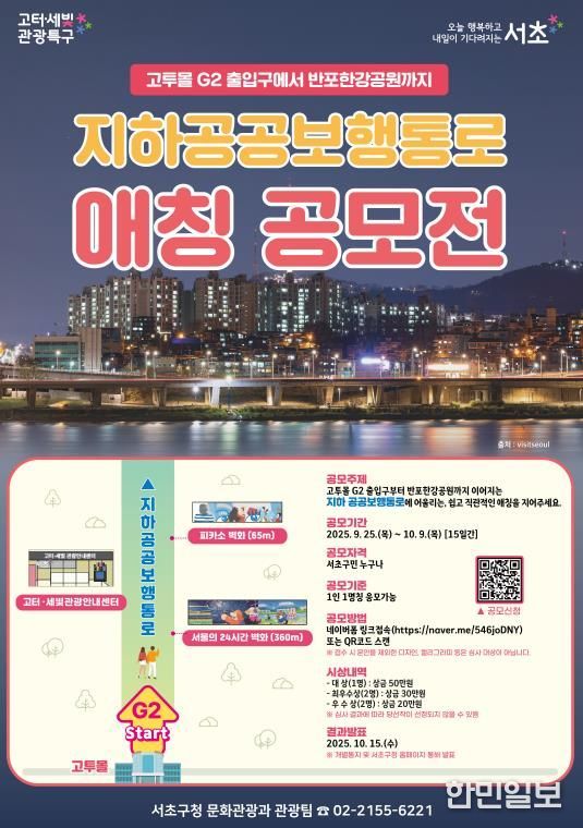 한민일보 서울포커스 곽중희 기자 | 서울 서초구는 10월 9일까지 고터·세빛 관광특구 내 위치해 고투몰과 반포한강공원을 잇는 지하 공공보행통로 애칭 공모전을 개최한다고 밝혔다.