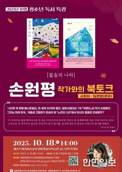 한민일보 서울포커스 곽동근 기자 | 세종특별자치시교육청평생교육학습관이오는 10월 18일 14시, 소설가이자 영화감독인 손원평 작가를 초청해 책마당(북콘서트)를 개최한다.