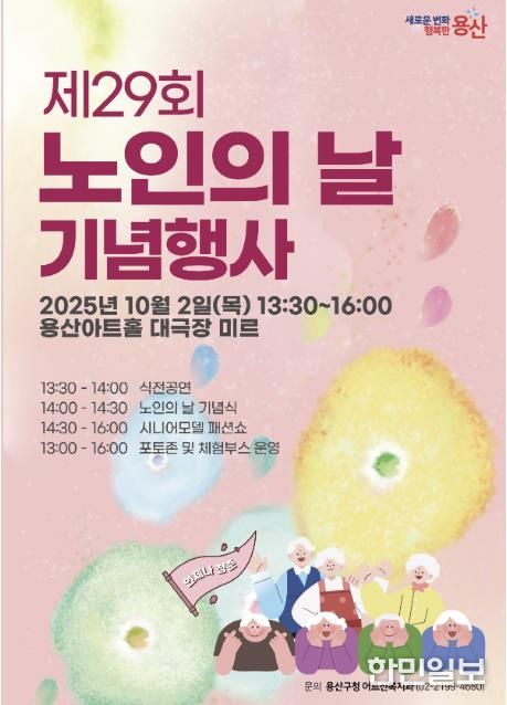 한민일보 서울포커스 김서윤 기자 | 서울 용산구는 ‘제29회 노인의 날’을 맞아 오는 10월 2일 오후 2시 용산아트홀 대극장 미르(녹사평대로 150)에서 노인의 날 기념식 및 시니어모델 패션쇼를 개최한다.