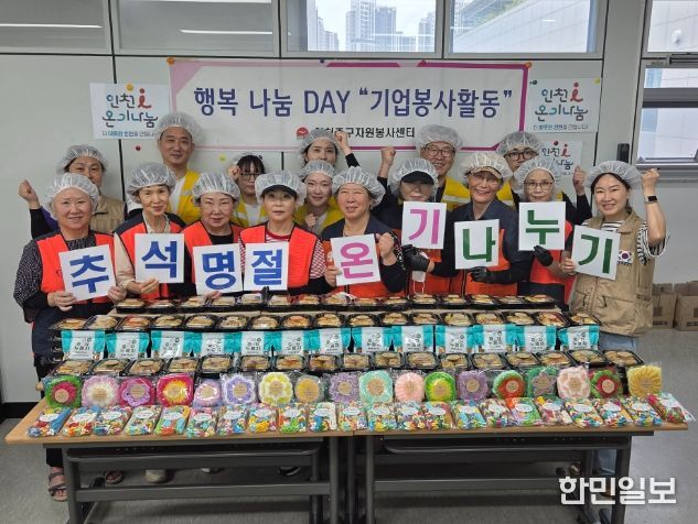한민일보 서울포커스 백진욱 기자 | 인천중구자원봉사센터는 민족 최대 명절인 추석을 맞아 지난 24일 인천공항에너지㈜(대표이사 이경용) 임직원과 함께 ‘온기 나눔 캠페인’과 연계한 ‘추석 명절 음식 나눔 행사’를 진행했다고 밝혔다.