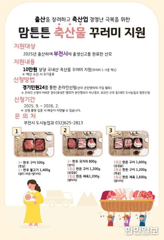 지원 대상은 2025년 1월 1일 이후 출산하고 부천시에 출생신고를 완료한 산모 2,384명으로, 1인당 10만 원 상당의 한우 또는 한돈 축산물 꾸러미를 제공한다.