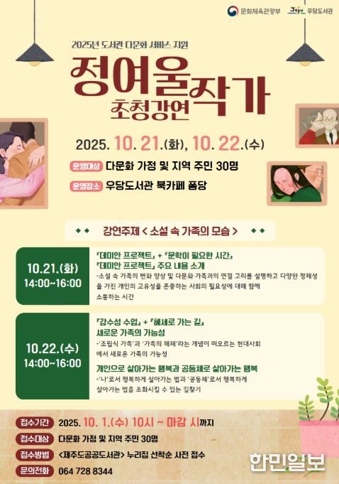 한민일보 서울포커스 김다남 기자 | 제주시 우당도서관은 2025년 도서관 다문화 서비스 지원 사업의 일환으로 ‘정여울 작가 초청 강연’을 오는 10월 21일과 22일 이틀간 북카페 퐁당에서 진행한다.