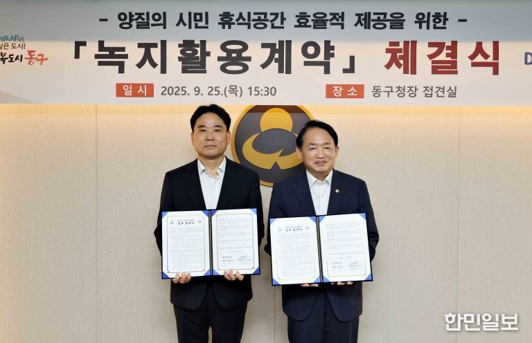 한민일보 서울포커스 백진욱 기자 | 인천 동구는 지난 25일 동원로엑스㈜(인천㈜ 대표이사 최안석)와‘녹지활용계약’을 체결했다고 밝혔다. 인천 최초로 진행된 이번 계약은 민간기업이 소유한 사유지를 주민에게 열린 녹지로 제공하는 새로운 방식의 민관 협력 모델이다.