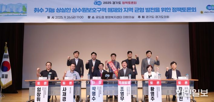 한민일보 서울포커스 김윤이 기자 | 경기도의회 도시환경위원회 박명수 의원(국민의힘, 안성2)이 좌장을 맡은 '취수 기능을 상실한 상수원보호구역 해제와 지역 균형 발전을 위한 정책토론회'가 26일 오전 11시, 공도읍 행정복지센터 대회의실에서 열렸다. 이번 토론회는 ‘2025 정책토론 대축제’의 일환으로 박명수 의원이 기획하고 경기도의회와 경기도가 공동으로 주최했다.