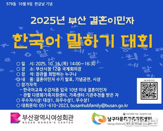 한민일보 서울포커스 임광현 기자 | 부산시 여성회관은 579돌 한글날을 맞아 오는 10월 16일 오후 2시, 시청 국제회의장에서 '2025년 부산 결혼이민자 한국어 말하기 대회' 및 '다문화가족 작품전시회'를 개최한다고 밝혔다.