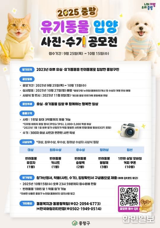 공모 주제는 ‘유실·유기 동물 입양 후 함께하는 행복한 일상’이다. 2023년 이후 중랑구에서 개 또는 고양이를 입양한 구민이라면 누구나 참여할 수 있으며, 입양을 증빙할 수 있는 서류와 함께 소중한 순간을 담은 사진과 수기를 제출하면 된다.
