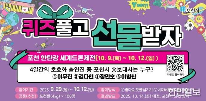 이번 이벤트는 오는 10월 9일부터 12일까지 한탄강 가든페스타 행사장에서 열리는 2025 포천 한탄강 세계드론제전을 홍보하고 시민 참여를 독려하기 위해 마련했다. 참여 방법은 포천시청 공식 누리소통망(SNS)에 게시된 이벤트 글에 ‘좋아요’와 댓글을 남기고, 네이버폼을 통해 정답을 제출하면 된다.