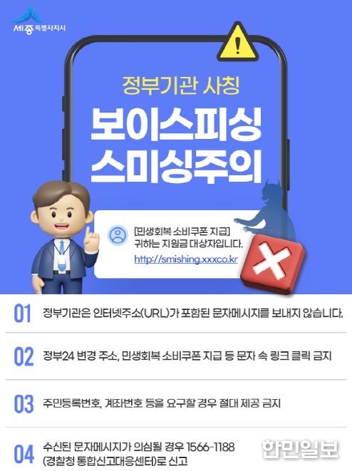 한민일보 서울포커스 김윤이 기자 | 세종특별자치시가 국가정보자원관리원 화재로 인한 전산시스템 복구 기간 전화나 문자메시지로 대체사이트 접속, 앱 재설치 등을 유도하는 범행이 우려됨에 따라 각별한 주의를 당부했다.