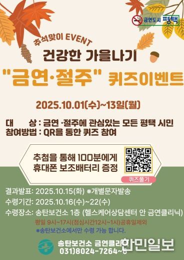 한민일보 서울포커스 황준형 기자 | 평택시 송탄보건소에서 오는 10월 1일부터 13일까지 시민 누구나 참여할 수 있는 ‘건강한 가을나기 금연·절주 퀴즈 이벤트’를 진행한다.