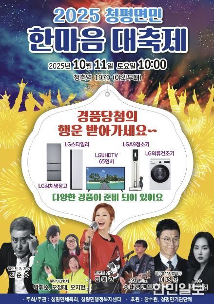 한민일보 서울포커스 최성훈 기자 | 가평군 청평면은 오는 10월 11일 청춘역 1979 야외무대에서 ‘2025 청평면민 한마음 대축제’를 개최한다. 면민의 날을 기념해 마련된 이번 행사는 청평면 체육회와 청평면 행정복지센터가 공동 주최·주관하고, 한국수력원자력㈜ 청평수력발전소와 관내 기관·단체가 후원한다.