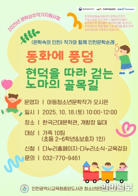 한민일보 서울포커스 유창렬 기자 | 인천광역시교육청중앙도서관은 10월 18일 오전 10시부터 12시까지 오시은 상주작가와 함께하는 인천문학순례를 운영한다.
