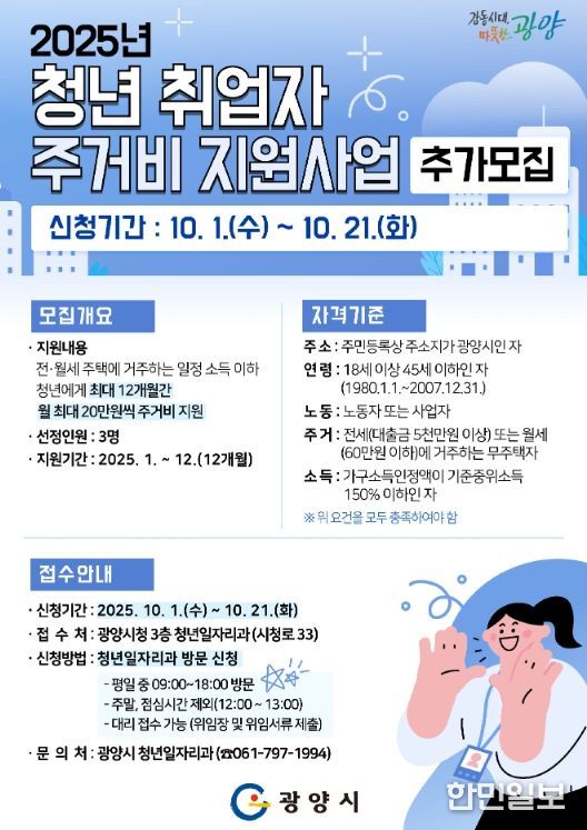 한민일보 서울포커스 임광현 기자 | 광양시는 청년들의 주거 안정을 위해 10월 1일부터 21일까지 ‘2025년 청년 취업자 주거비 지원사업’ 추가 모집을 진행한다고 밝혔다.