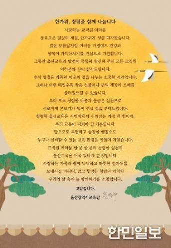 한민일보 서울포커스 임경복 기자 | 울산광역시교육청은 추석을 앞두고 1일 울산 지역 전 교육기관과 학교 교직원들에게 청렴 의지를 다지는‘청렴 서한문’을 보냈다.