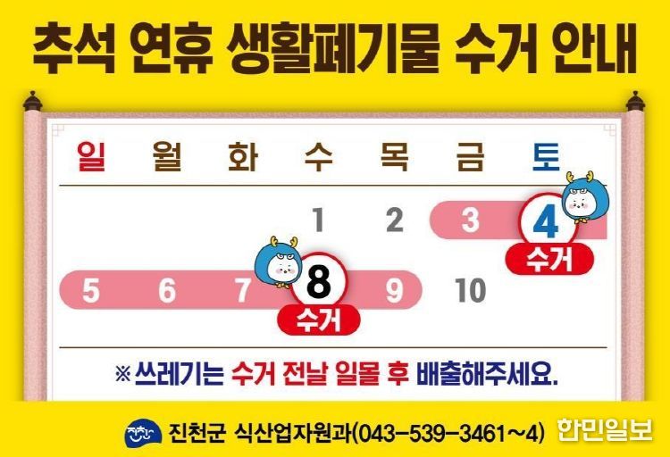 한민일보 서울포커스 김다남 기자 | 충북 진천군은 군민들이 명절을 보다 쾌적하게 보낼 수 있도록 추석 연휴 지역 생활 쓰레기 수거 일정을 일부 조정한다고 1일 밝혔다.