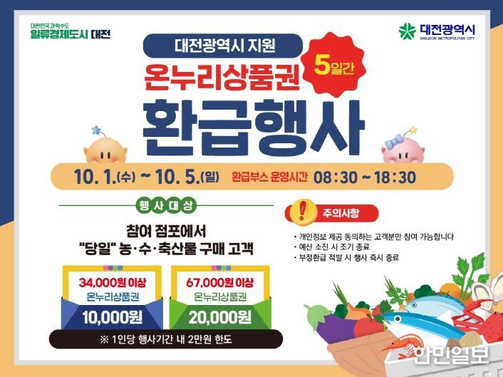 이번 행사는 농림축산식품부·해양수산부가 주관하는 전국 환급행사와 연계해 추진되며, 대전시민이 더 많은 혜택을 체감할 수 있도록 지역 전통시장에서 별도 운영된다.