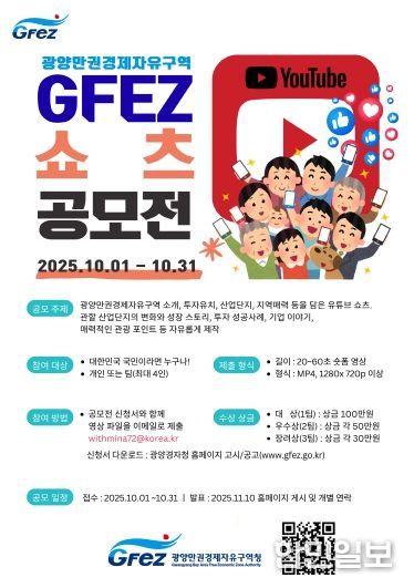 한민일보 서울포커스 임광현 기자 | 광양만권경제자유구역청(청장 구충곤)은 10월 1일부터 31일까지 국민 참여형 ‘2025 GFEZ 유튜브 쇼츠 공모전’을 개최한다고 밝혔다.
