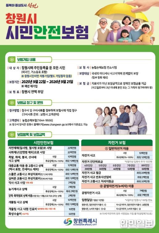 한민일보 서울포커스 김서윤 기자 | 창원특례시는 시민들이 더 많은 보험혜택을 받을 수 있도록 2025년 창원시 시민안전보험을 9월 22일부터 개정하여 운영한다고 1일 밝혔다.