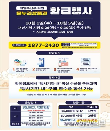 한민일보 서울포커스 임광현 기자 | 부산시는 추석 명절 소비자 장바구니 부담을 완화하고 소비를 활성화하기 위해 오는 10월 5일까지 전통시장 수산물 온누리상품권 환급행사를 개최한다고 밝혔다.