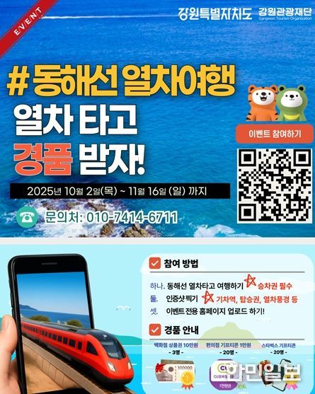 한민일보 서울포커스 곽중희 기자 | 강원특별자치도와 강원관광재단은 오는 10월 2일부터 11월 16일까지‘KTX 동해선 철도여행 인증 이벤트’를 운영한다고 밝혔다.