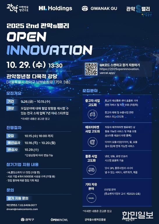 한민일보 서울포커스 곽중희 기자 | 관악구가 자동차, 물류 분야 글로벌 네트워크를 보유한 ‘HL홀딩스’와 함께 ‘2025 제2회 관악S밸리 오픈 이노베이션’에 참가할 기업을 모집한다.