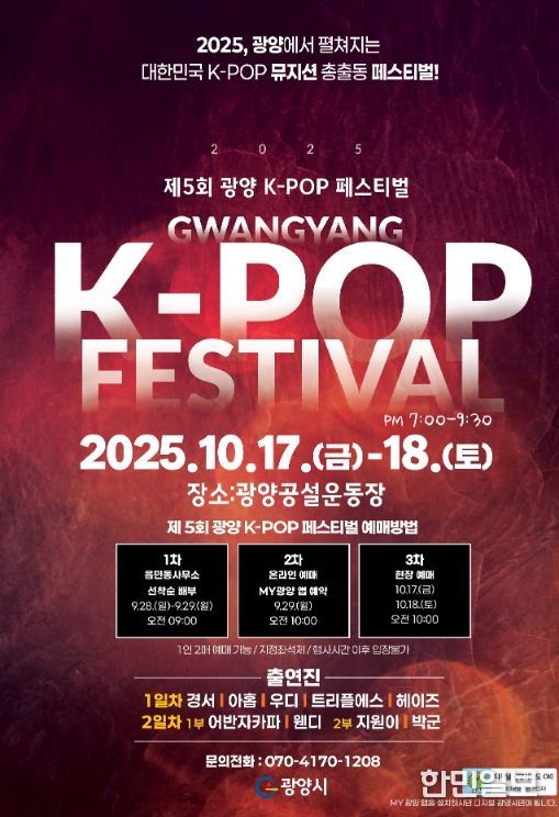 한민일보 서울포커스 임광현 기자 | 광양시는 오는 10월 17~18일 개최되는 '제5회 광양 K-POP 페스티벌' 입장권이 예매 시작 전후 폭발적인 반응을 얻으며 대부분 매진됐다고 밝혔다.