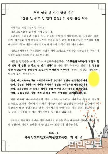 한민일보 서울포커스 임철현 기자 | 충청남도태안교육지원청은 추석 연휴 시기를 맞아 청렴한 공직문화를 확산하기 위해 ‘선물 안 주고 안 받기 운동’을 강조하는 청렴 서한문을 홈페이지에 게시했다.