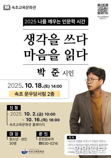 한민일보 서울포커스 곽중희 기자 | 속초교육문화관(관장 안영자)은 10월 18일 14시 속초 문우당서림에서 청소년과 지역주민을 대상으로 5차 ‘인문학 시간’을 운영한다.
