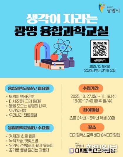 한민일보 서울포커스 임광현 기자 | 광명시는 오는 10월 27일부터 11월 19일까지 초등학교 3~5학년을 대상으로 ‘생각이 자라는 광명 융합과학교실’ 시범수업을 운영한다.