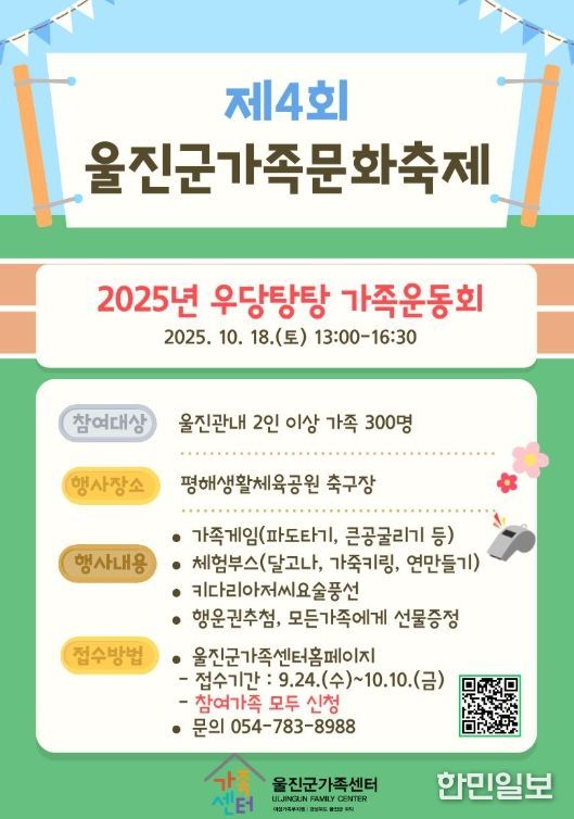 한민일보 서울포커스 김서윤 기자 | 울진군은 울진군가족센터가 오는 10월 18일 오후 1시부터 평해생활체육공원 축구장에서 제4회 울진군가족문화축제‘우당탕탕 가족운동회’를 개최한다.