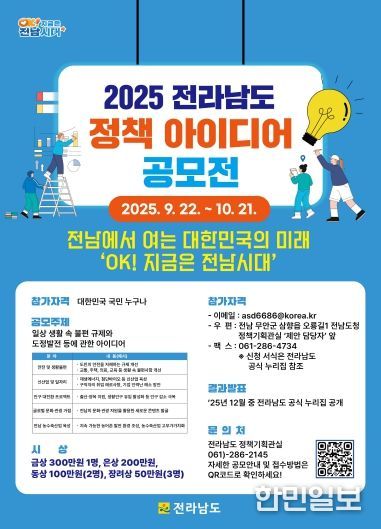 한민일보 서울포커스 박정민 기자 | 전라남도가 새 정부의 실용주의 기조에 맞춰 ‘생활 속 불편을 찾고 이를 개선할, 지역의 미래를 먹여 살릴 정책’을 주제로 ‘2025년 전라남도 정책 아이디어 공모전’을 개최한다.