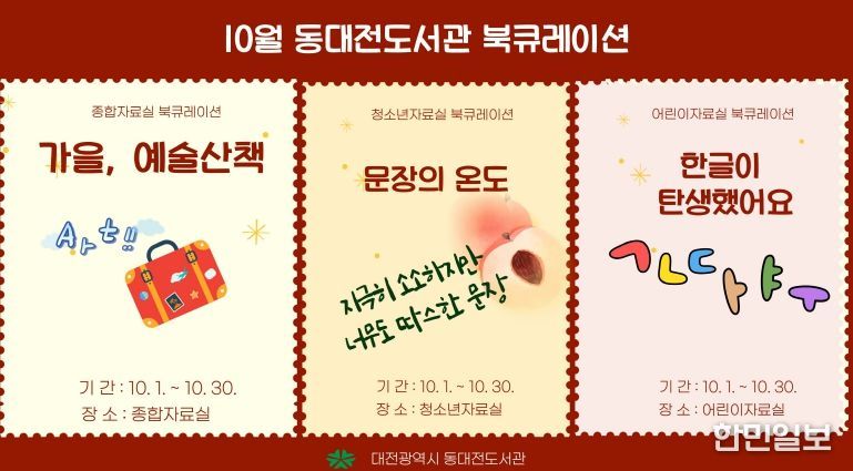 한민일보 서울포커스 김서윤 기자 | 동대전도서관은 가을 독서의 계절을 맞아 10월 한 달간 연령별 맞춤 주제 북큐레이션 전시를 운영한다고 10일 밝혔다.