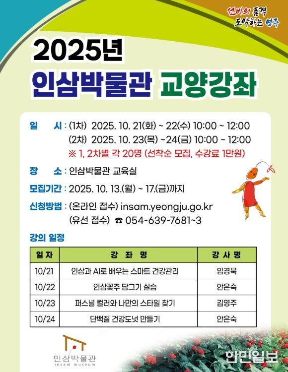 한민일보 서울포커스 김봉순 기자 | 영주시 인삼박물관은 2025 영주 풍기인삼축제와 연계해 오는 10월 21일부터 24일까지 시민을 대상으로 생활 속 건강과 문화를 접목한 특별 교양강좌를 운영한다.