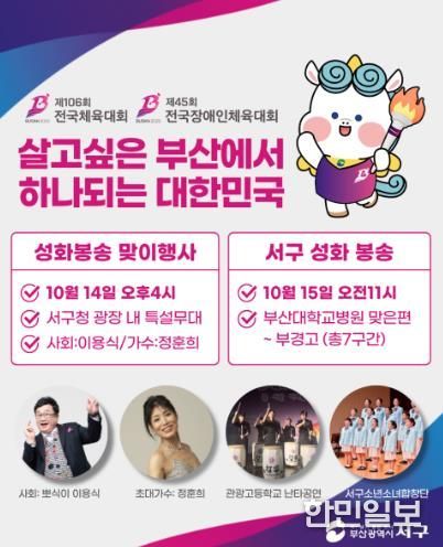 한민일보 서울포커스 임광현 기자 | 부산 서구는 오는 10월 14일 16시, 제106회 전국체육대회와 제45회 전국장애인체육대회의 시작을 알리는 “성화의 불꽃, 하나되는 서구”를 주제로 성화봉송 맞이행사를 서구청 광장 특설무대에서 개최한다고 밝혔다.