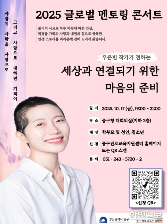 한민일보 서울포커스 임광현 기자 | 부산 중구는 중구 진로교육지원센터 주관으로 오는 10월 17일 오후 7시, 중구청 지하2층 대회의실에서 '2025 글로벌 멘토링 콘서트'를 개최한다.