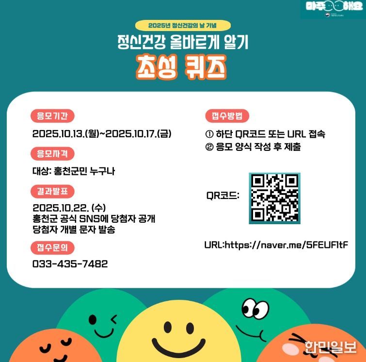 한민일보 서울포커스 진광성 기자 | 홍천군은 10월 13일부터 정신건강의 중요성을 널리 알리고, 시민들의 올바른 인식개선을 위해 정신건강 인식개선 초성퀴즈 이벤트를 개최한다.