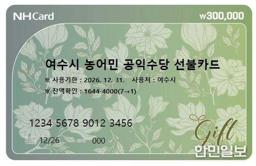 한민일보 서울포커스 임광현 기자 | 여수시는 2026년부터 농어민 공익수당 지급방식을 기존 ‘여수사랑상품권(지류형)’에서 ‘선불카드’로 전환한다고 밝혔다.