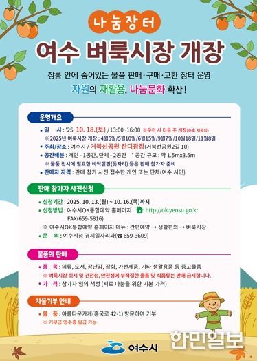 한민일보 서울포커스 임광현 기자 | 여수시는 오는 10월 18일 오후 1시부터 4시까지 거북선공원 잔디광장에서 2025년 ‘제5회 여수벼룩시장’을 개최한다.
