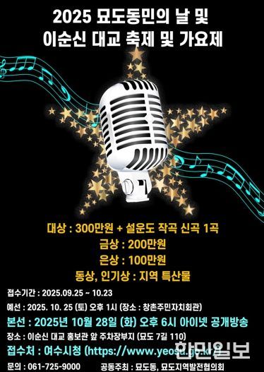 올해 처음으로 개최되는 이순신대교 가요제는 전국의 가수 지망생들이 참가해 실력을 겨루는 미래 스타 발굴 무대로 주목받고 있다. 참가 접수기간은 오는 10월 23일까지이며, 예선은 10월 25일 오후 1시 창촌주민자치회관에서, 본선은 10월 28일 오후 6시 축제 무대에서 열린다.