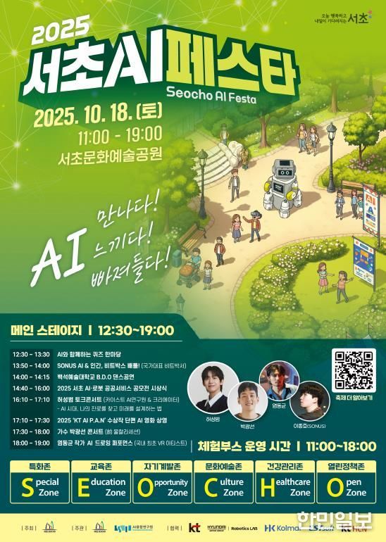 한민일보 서울포커스 곽중희 기자 | 서울 서초구는 ‘양재 AI 특구’ 지정 1주년을 기념해 오는 18일 서초문화예술공원에서 누구나 인공지능(AI)을 만나고, 느끼고, 빠져들 수 있는 ‘2025 서초 AI 페스타’를 개최한다고 밝혔다.