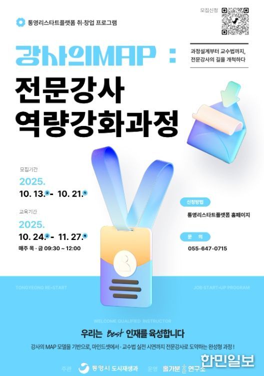 한민일보 서울포커스 김서윤 기자 | 통영시는 전문강사 발굴 및 양성을 위한 ‘강사 MAP : 전문강사 역량강화 과정’의 수강생을 오는 21일까지 모집한다고 전했다.