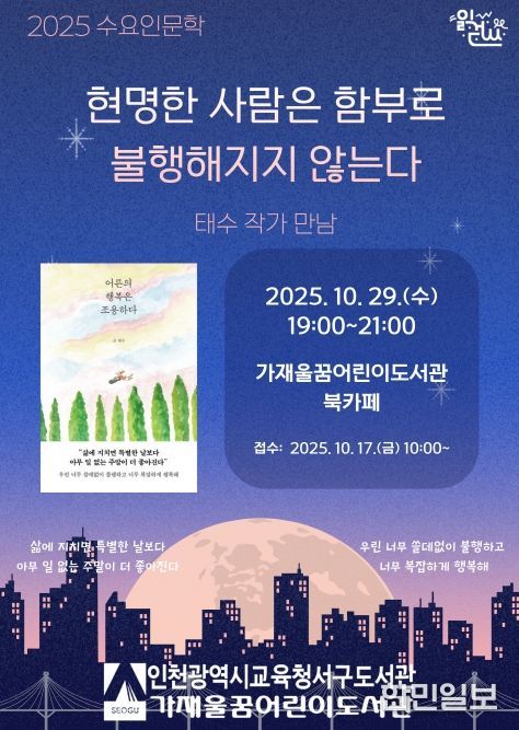 한민일보 서울포커스 유창렬 기자 | 인천광역시교육청서구도서관은 10월 29일 오후 7시부터 9시까지 『어른의 행복은 조용하다』의 저자 태수 작가를 초청해 ‘수요인문학’ 강연 ‘현명한 사람은 함부로 불행해지지 않는다’를 진행한다.
