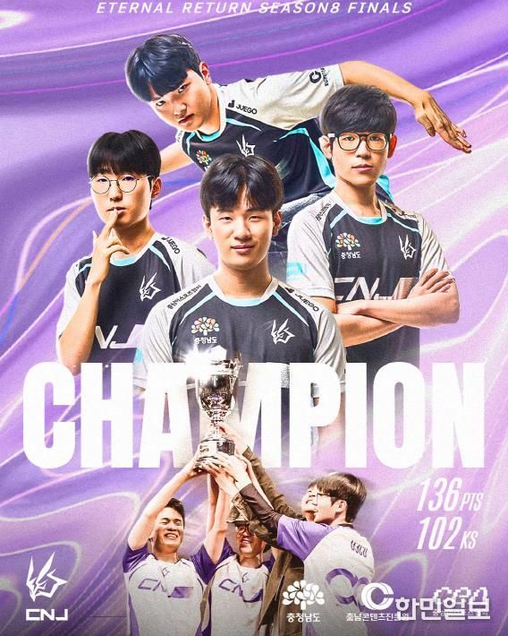 한민일보 서울포커스 최성훈 기자 | (재)충남콘텐츠진흥원은 충청남도를 대표하는 이스포츠 게임단 ‘CNJ Esports가 2025년 10월 12일 대전 드림 아레나에서 열린 이터널 리턴 마스터즈 시즌8 파이널에서 우승을 차지했다고 밝혔다.