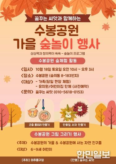 한민일보 서울포커스 백진욱 기자 | 인천 미추홀구는 오는 18일 수봉공원(숭의동 8-183)에서 가을의 정취를 만끽할 수 있는 ‘가을 숲 놀이 행사’를 개최한다.