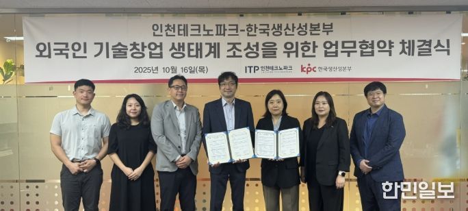 한민일보 서울포커스 유창렬 기자 | 인천테크노파크는 지난 16일 한국생산성본부와 ‘외국인 창업 활성화 및 창업 생태계 조성을 위한 업무협약(MOU)’을 체결했다.